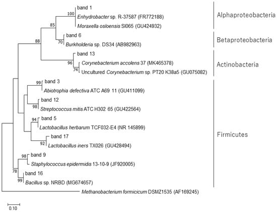 Each DGGE gel band selected was carefully excised using a sterile Pasteur pipette and placed in 50 µL of sterile water. Each gel was kept overnight at 4 °C to elute the DNA, then the eluate was used as a DNA template and reamplified as described above. The sequences were automatically analyzed with an ABI 3130xl Genetic Analyzer (Applied Biosystems, Foster City, CA, USA) using the BigDye terminator v3.1 cycle sequencing kit (Applied Biosystems). Each DNA sequence was compared with published sequences using NCBI BLAST (http://www.ncbi.nlm.nih.gov, accessed on 30 July 2021). A phylogenetic tree was constructed with the maximum-likelihood method in MEGAX software. The dataset was bootstrapped 1000 times.