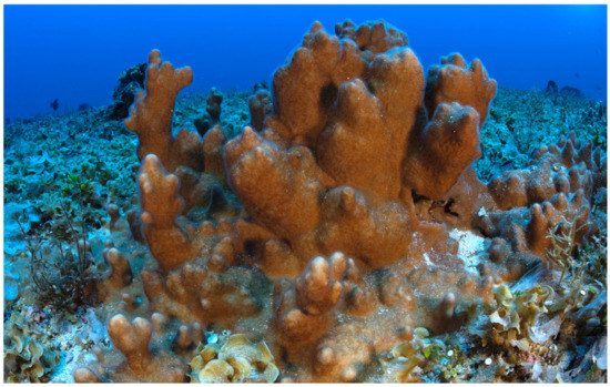In recent years, mesophotic coral ecosystems have been a growing topic of interest. These mostly unexplored habitats shelter a rich and unique biodiversity [1]. Within the context of global change, they might serve as a source for recolonization after disturbances in shallower reefs. Millepora species, also called fire corals, are important components of coral reefs, and can demonstrate very high local abundance [2]. Because of their calcium carbonate skeletons, Millepora hydrocorals can build large colonies and thus have ecological roles similar to scleractinian corals. Indo-Pacific Millepora species have widespread distributions observed from the surface to 40 m [2]; very few Millepora species have been recorded below 50 m, and usually from a few imprecise dredging samples [1,3,4,5]. During an expedition to Mount La Pérouse (Mascarene Plateau, Southwestern Indian Ocean) from 27 October to 5 November 2019, several Millepora colonies were recorded at depths from 59 to 67 m. The colony growth forms were somewhat distinct from the usual growth forms encountered in Réunion Island [6], where three species co-occur: M. cf. exaesa Forsskål 1775, M. cf. platyphylla Hemprich and Ehrenberg 1834 and M. tenera Boschma 1949. Colonies were either encrusting, with small digitations, or massive and unbranched (Figure 1), with numerous scattered vertical swellings of varied diameters and lengths, dome or column-shaped, digitate on top with dactylozooids in extension covering the entire surface like hairs, as is usual on Millepora colonies. Based on the shape of the protuberances, on the color and on the number of dactylopores per cyclosystem, these colonies show affinities with M. exaesa. These records are likely the world’s deepest in situ living Millepora colonies ever reported. As we continue to explore more remote places and wider bathymetric depths, our knowledge of species distribution and endemism is being refined, as exemplified by the recent range re-extension of M. cf. platyphylla in the Eastern Pacific [7].