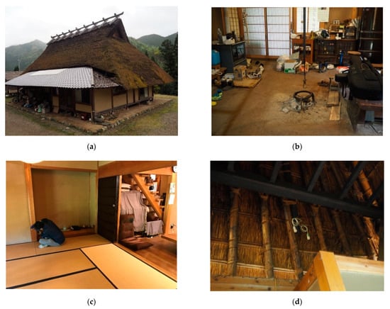 Photographs of (a) the subject house, (b) the earth floor space, (c) the Japanese-style room and dining room, and (d) underside of the thatched roof.