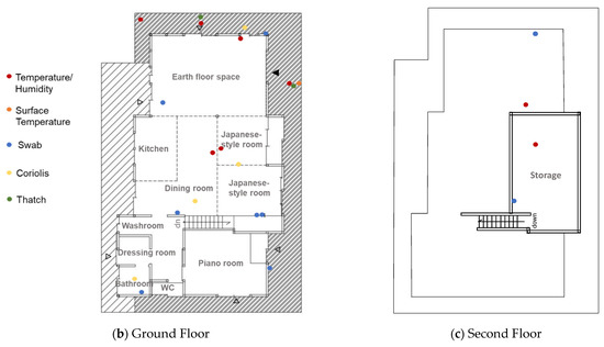 (a) Floorplan of the subject house. (b,c) The temperature/humidity measurement points (red and orange dots) and the microbial sampling locations (blue, yellow, and green dots) were plotted on the plan. Coriolis (yellow plots) means sampling locations using a biological air sampler (Coriolis Micro, Bertin Technologies, France). ▲ indicates the main entrance, and △ indicates the back entrances.
