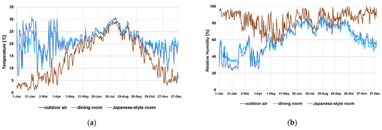 These seasonal variations are supposed to reflect room temperature control methods. In this house, occupants opened the windows and partitions without air conditioning in summer, so indoor air temperature and humidity were similar to those of the outdoor air. In winter, they used a wood-burning stove and closed windows. Thus, the temperature and humidity of the indoor air were different between the room with the stove and the room without the stove, and these differed greatly from the outdoor air.
