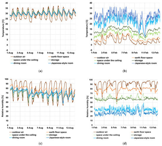 Measured value of temperature (°C)/relative humidity (%) in 2019. (a) Temperature in summer (1–14 August 2019), (b) temperature in winter (1–14 February 2019), (c) relative humidity in summer (1–14 August 2019), and (d) relative humidity in winter (1–14 February 2019).