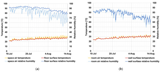 For the Japanese-style room wall, the daily range of surface temperatures was approximately 2 °C narrower than that of the air, and the surface relative humidity fluctuated a few hours behind that of the air. (Figure 5b).