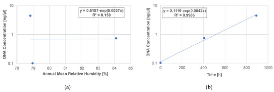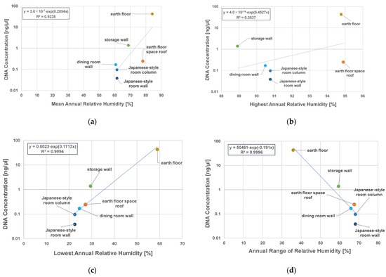 No correlation between DNA concentration and the highest annual relative humidity was observed (Figure 6b, R2 = 0.3537). While positive correlations with the DNA concentrations were observed for the annual mean value of relative humidity and the annual lowest value of relative humidity, with correlation coefficients of 0.6574 and 0.9994, respectively (Figure 6a,c). The annual range in relative humidity was negatively correlated with the DNA concentration (Figure 6d, R2 = 0.9996). The temperature and humidity of the surface may affect the numbers of microorganisms on indoor wall and floor surfaces. For the relationship between relative humidity and microorganisms, Danmiller et al. reported that the growth of microorganisms in house dust is accelerated in a high-humidity environment [30].