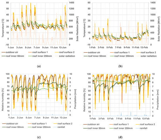 Measured values of temperature (°C)/relative humidity (%) of thatched roofs from 2019 to 2020. (a) Tempera in summer (1–14 June 2019), (b) temperature in winter (1–14 February 2020), (c) relative humidity in summer (1–14June 2019), and (d) relative humidity in winter (1–14 February 2020), amount of solar radiation is also plotted in figures of temperature ((a,b) pale orange lines), and the amount of precipitation was also plotted in figures of relative humidity ((c,d) pale blue lines).
