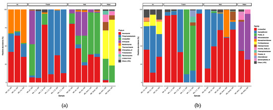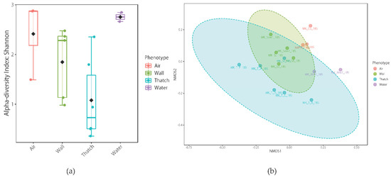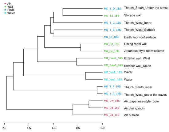 Sixteen and 13 samples were used for analysis of the 18S rRNA gene and 16S rRNA gene, respectively. Good’s coverage values were greater than 99.5% for all the samples (Supplementary Tables S2 and S3). In terms of the richness and evenness within the samples, water displayed the highest values but did not differ significantly among the samples (p > 0.05) (Figure 9a). Because of the characteristics of traditional Japanese houses with thatched roofs and earth floorspace, we collected samples from various indoor and outdoor locations (mud walls, wooden walls, earth floor, thatched roof, water, and air) to understand the microbial community structure (Figure 2). Regarding community similarity (i.e., beta diversity and hierarchical clustering), samples were grouped by phenotype, but there was a high degree of diversity among samples. Interestingly, indoor and outdoor aerosol samples overlapped (MK-Cw_18S, MK_Cd_18S and MK_Co_18S). This is different from the results of previous studies conducted in modern houses [5,26]. In general, the microbial community structure inside and outside the house is very different, and most microbes inside the house are of human origin. Even doorknobs outside the house have a very different microbial community origin from those inside the house [43]. It is likely that there is sufficient microbial exchange between the outside and inside (Figure 9b and Figure 10). Buildings affect the biogeography and the pattern of microbial spread indoors [44,45] via the building materials, surfaces, and products used [42,46,47], indoor environmental conditions (temperature, humidity, light, airflow, etc.) [30,48,49], indoor-outdoor connections, and associated microbes [19,50], etc. All of these factors affect the location of microorganisms in the built environment and their survival there. Although the built environment may seem inconvenient for microorganisms [51], they can survive indoors for months [52,53,54,55], and indoor environmental conditions can promote intermittent growth of bacteria and fungi [30]. In traditional Japanese houses with thatched roofs and earth floors, a characteristic temperature and humidity environment is formed (Figure 4). In addition, microbial diversity is presumably increased by the intervention of bringing in soil and mud walls wherein microorganisms may be fermenting plant matter, making this study distinct from many studies on microorganisms in modern buildings.