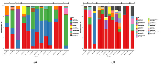 Taxonomic composition of prokaryotes at the phylum (a) and genus (b) levels.