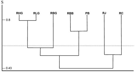 Species similarity (S) of the species composition in Uropodina communities in examined locations: PB—Białowieża Primeval Forest, RC—Cisy Staropolskie im. Leona Wyczółkowskiego Nature Reserve, RJ—Jakubowo Nature Reserve, RLG—Las Grądowy near Mogilnica Nature Reserve, RBB—Bytyńskie Brzęki Nature Reserve, RBG—Brzęki near Stara Gajówka Nature Reserve, RHG—Huby Grzebieniskie Nature Reserve.