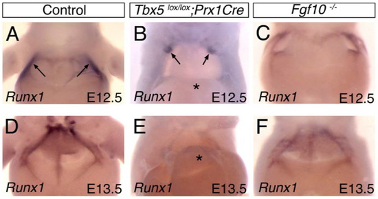 In situ hybridisation for Runx1 in control, Tbx5lox/lox;Prx1Cre and Fgf10-/- mice. Ventral views of embryos at E12.5 (A–C) and E13.5 (D–F). Runx1 is expressed in the sternal bands (arrows) in control (A,D) and Fgf10-/- (C,F) embryos, but is restricted to a region of the ventral body wall in E12.5 Tbx5lox/lox; Prx1Cre mice (arrows, B) and is not detected in E13.5 Tbx5lox/lox; Prx1Cre mice (E). Herniation of the internal organs following the failure of body wall closure is present in B and E (asterisk). Figure adapted from [8].