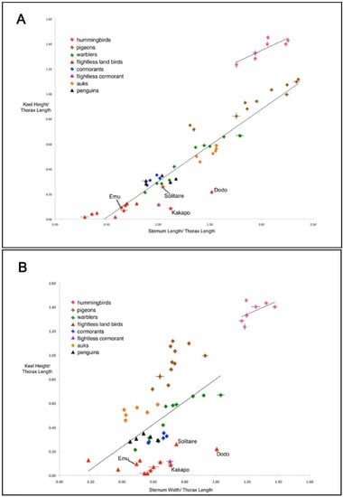 Flightless birds generally have flattened, shorter sterna than flighted birds, occupying the lower left region of the graphs (Figure 3). However, three of the flightless birds show relatively larger sterna than other flightless birds (solitaire, kakapo and dodo). This may reflect the reported use of the wings or sternum in display, fighting or balance, which has led to these species retaining a larger sternum and more pectoral muscle mass [46,47]. The correlation between sternum dimensions in flightless birds is generally weaker than for flying birds, with the points on the graphs fitting less closely to the line of best fit (Figure 3). This may reflect the reduced evolutionary constraint placed on sternum dimensions in birds that no longer require large flight muscles.