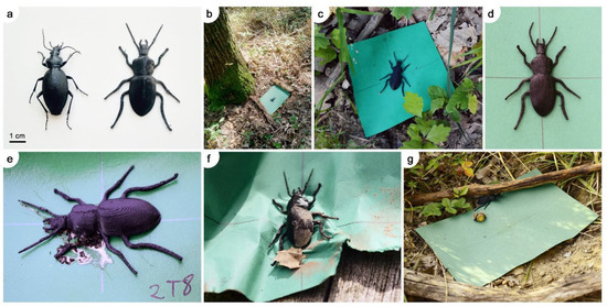 Printed decoy of Carabus coriaceus in comparison with a real specimen (a). Decoys installed on the green cardboard (b) were checked for turns (c), broken or bent parts (d), predation attempts by birds (e), wild boars (f) or relocations (g).