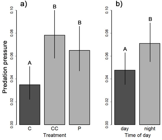 The effect of treatment (a) and time of day (b) on the predation pressure. Vertical lines represent a 95% confidence interval and different capital letters above the bars indicate significant differences based on Tukey multiple comparisons of means.