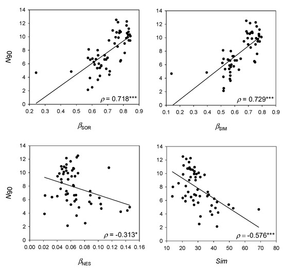 N90 is influenced by both turnover and nestedness. On one hand, species loss was the main cause of decreases in