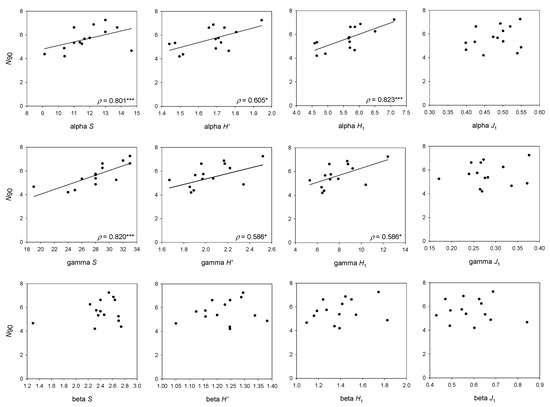 For the whole bathymetric range considered, the higher correlation of N90 with the effective form of alpha H′ shows that values of N90, whose calculation is based on the comparison of the abundances of each pair of samples composing the group or community, are more similar to a mean value of H1 in the samples of the group or the community (alpha H1) than H1 calculated for the whole community (gamma H1). This means that frequent species in the group or community contribute more to N90 than abundant species (i.e., with absolute abundant values) in the whole community. This is endorsed by the high correlation of N90 and total number of species in the whole group of samples or community (gamma S). The difference between alpha, beta and gamma S is that alpha S takes the mean number of species in the community, beta S the replacement of species between samples of the community and gamma S is the total number of species in the community. Thus, the high correlation of N90 with gamma S has an easy explanation, because the species identity is not lost and the total number of species in the community is taken into account during the calculation of N90. However, N90 is not equal to gamma S, because it only takes into account the species that contribute to 90% similarity in the group of samples—or in other words, the species that are more representative in terms of frequency of appearance and abundance from the group of samples in the community.