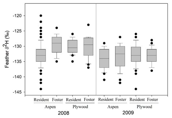 Feather δ2H values (‰) for resident and cross-fostered nestling tree swallows at St. Denis, Saskatchewan, 2008 (n = 96) and 2009 (n = 136), in relation to nest box type of rearing (aspen, plywood). Boxplot shows median (horizontal line), 25% and 75% values (lower and upper edges of shaded box), 5% and 95% values (horizontal whiskers), and extreme values (filled circles).