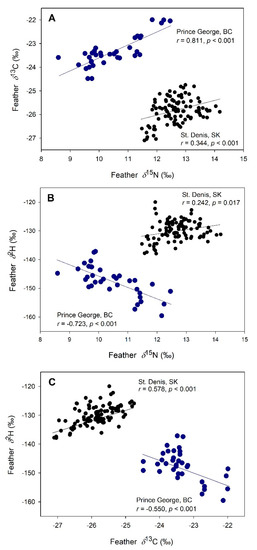 Feather isotope values (‰) for nestling tree swallows from St. Denis, SK (black circles) and Prince George, BC (blue circles), 2008. Pearson correlations (r) are given for relationships between δ13C and δ15N (A), δ2H and δ15N (B), and δ2H and δ13C (C); regression lines are shown for illustration.