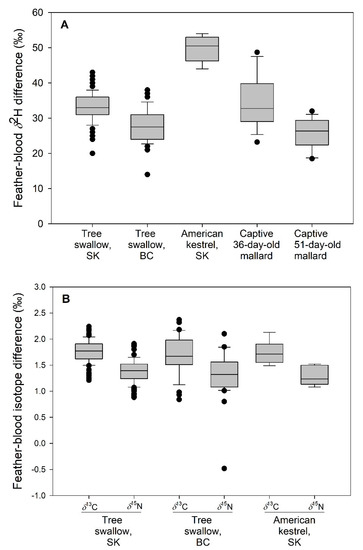 Blood-feather differences (‰) for δ2H (A) and δ13C and δ15N (B) in wild tree swallows from British Columbia (BC) and Saskatchewan (SK), nesting in plywood and aspen boxes; wild American kestrels nesting in plywood boxes in boreal forest, SK, and female mallard ducklings raised in captivity (δ2H difference only). Differences may be slightly smaller for δ2H in swallows but not kestrels due to inclusion of blood lipids (see Table 2), 2008; n = 16 and 14, respectively, for 36- and 51-day-old mallard duckling age groups. Boxplot shows median (horizontal line), 25% and 75% values (lower and upper edges of shaded box), 5% and 95% values (horizontal whiskers), and extreme values (filled circles).