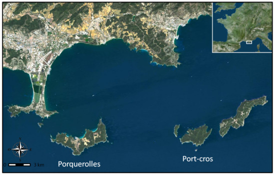 Study location Port-Cros and Porquerolles are situated off the south-east coast of France’ located respectively 8.3 km and 2.6 km from the coast which are 9 km apart (google-earth© image).