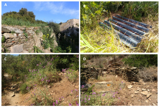 Sampling locations on Port-Cros before (A,B) and after wild boar outbreak in 2016 (C,D). Image (A) shows an intact dry stone wall. Image (B) shows corrugated fibrocement coverboard positioned along a hedge in a meadow. Image (C) shows rooting of the ground, leading to the disappearance of the herbaceous layer and of many shrubs. Image (D) shows the partial destruction of a stone wall. Overall a variety of habitat types was affected, we estimated that 60% to 80% of the whole area was plowed.