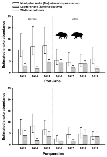 This study has shown that wild boar (Sus scrofa) outbreaks can clearly have devastating impacts on mainland snakes [15] with snake counts and mark-recapture demographic analyses both revealing a strong negative effect of wild boars on snakes on one island, especially on Montpellier snakes (Malpolon monspessulanus), and to lesser extent on ladder snakes (Zamenis scalaris). The combination of snake abundance estimates and demographic trends performed in two islands, before and after the proliferation of wild boars that occurred in one site but not in the other, offered comparative information. After 2016, and only on the island affected by wild boars, did we find a significant decline in snake counts, recruitment, and annual population growth rates in both species. These results provide further evidence that wild boars can be destructive when they proliferate, notably in the absence of predatory pressures (wolf or hunters) [14,47,48,49].