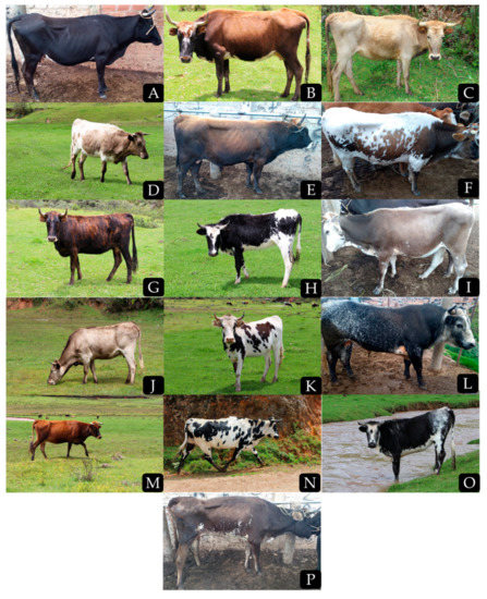 The coat coloring pattern was classified as simple (one color), compound (more than two defined colors, including spots), or mixed (gradient color scheme with no defined limits). The coat color was registered as black (A), reddish bay (B), light brown (C), dark brown or muddy (D, E), white moor (F), brindle (G), black overo “callejón” (H), smoky “cardeno” (I), mulatto (J), pinto (K) [21,22]. In addition to these, local color denominations were registered, such as nevado rosillo (L), jalmada (M), frijol (N), casullo (O) or bay (P) (Figure 1). Also, we distinguish the hoof (dark or light), and horns tip (black, dark, or amber) colors, and the presence or absence of horns [21,22].