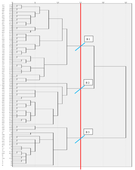 In this study, three biotypes of Creole cows were differentiated: biotypes I, II, and III grouped 46, 20, and 29 cows, respectively (Figure 2). The validation of biotypes differences by analysis of variance of hypothesis test, was highly significant (p < 0.001), which showed that there were differences among biotypes (Table S5). South American creole bovine has evolved by natural selection and adapted to different conditions such as humid tropical forests, subtropical dry forests, and mountainous and Patagonian steppe. Nowadays, most South and Central American countries have Creole bovine with specific characteristics (milk, meat, or dual purpose) with broad genetic diversity and phenotypic variability. Unfortunately, in recent years, there has been a drastic reduction in their population [25,26]. Similarly, four biotypes of Creole bovine were identified in the Patagonian (Northeast of Argentina), differentiating northern animals from the southern ones [27].