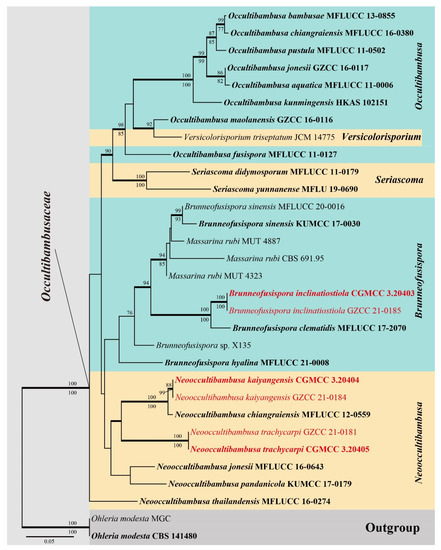| Neooccultibambusa chiangraiensis | MFLUCC 12-0559 | KU712458 | KU712442 | KU764699 | _ | KU872761 |