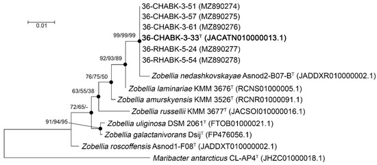 The following are available online at www.mdpi.com/article/10.3390/d13110520/s1, Table S1: MLSA primers designed based on genome sequence of the 36-CHABK-3-33T used for estimation of intraspecies genetic variability, Figure S1: Maximum-likelihood (ML) phylogenetic tree based on concatenated partial dnaK-gyrB-pyrH-recA-topA (2570 bp) gene sequences, showing the phylogenetic position of six alga-associated isolates and members of the genus Zobellia, Table S2: MLSA distances values for the selected strains in this study.