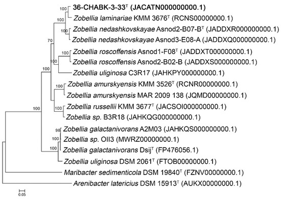 To quantify the relatedness of 36-CHABK-3-33T to other Zobellia strains, the ANI, AAI, and dDDH values were calculated on online servers ANI/AAI-Matrix [24] and TYGS platform [25], respectively. The ANI/AAI values between strain 36-CHABK-3-33T and phylogenetically closest neighbors Z. nedashkovskayae Asnod2-B07-BT and Z. laminariae KMM 3676T were 89.7%/92.9% and 94.2%/95.8%, respectively. The obtained ANI values were lower than ANI threshold of 95%, which is recommended for species delineation [32,33]. The dDDH values (formula d4) between strain 36-CHABK-3-33T and two closest neighbors Z. laminariae KMM 3676T and Z. nedashkovskayae Asnod2-B07-BT were 59.6 ± 2.7% and 39.5 ± 2.5%, respectively. The obtained dDDH relatedness values were below the threshold value for species boundaries of 70% [34]. These data clearly show that strain 36-CHABK-3-33T represents a novel species within the genus Zobellia.