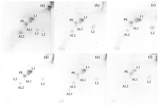 Two-dimensional thin-layer chromatogram of polar lipids extracted from strain 36-CHABK-3-33T. (a) Zobellia galactanivorans CIP 106680T; (b) Zobellia amurskyensis KMM 3526T; (c) Zobellia laminariae KMM 3676T; (d) Zobellia russellii KMM 3677T; (e) and Zobellia uliginosa CIP 104808T; (f) PE, phosphatidylethanolamine; AL1 and AL2, unidentified amino lipids; L1–3, unidentified lipids.
