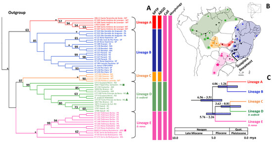 - Costa, L.P. The historical bridge between the Amazon and the Atlantic Forest of Brazil: A study of molecular phylogeography with small mammals. J. Biogeogr. 2003, 30, 71–86. [Google Scholar] [CrossRef]