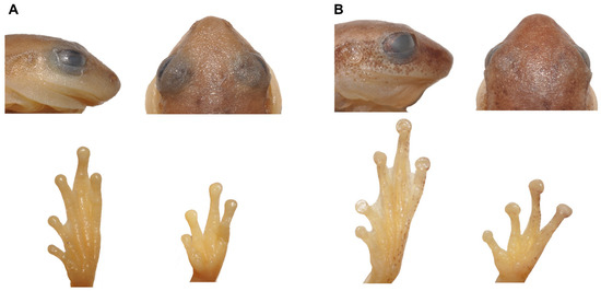 - Orrico, V.G.; Grant, T.; Faivovich, J.; Rivera-Correa, M.; Rada, M.A.; Lyra, M.L.; Cassini, C.S.; Valdujo, P.H.; Schargel, W.E.; Machado, D.J.; et al. The phylogeny of Dendropsophini (Anura: Hylidae: Hylinae). Cladistics 2021, 37, 73–105. [Google Scholar] [CrossRef]