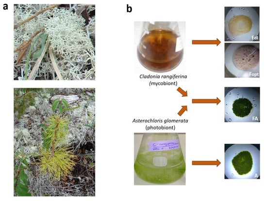 - Armaleo, D.; Müller, O.; Lutzoni, F.; Andrésson, Ó.S.; Blanc, G.; Bode, H.B.; Collart, F.R.; Dal Grande, F.; Dietrich, F.; Grigoriev, I.V.; et al. The lichen symbiosis re-viewed through the genomes of Cladonia grayi and its algal partner Asterochloris glomerata. BMC Genom. 2019, 20, 605. [Google Scholar] [CrossRef] [PubMed]