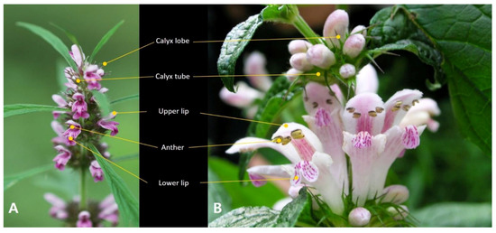 Previous studies on the reproductive biology of Leonurus species reported that their flowers were visited by various insects—L. japonicus: honey bee (Apis mellifera Linnaeus, 1758) and bumblebees [Bombus opifex Smith, 1879, B. morio (Swederus, 1787), and B. bellicosus Smith, 1879] [47]; L. sibiricus L.: bumblebees (Bombus opifex, B. morio, and B. bellicosus) [48]; and L. cardiaca L.: the same as L. japonicus and ladybird beetles, adult blowfly, cabbage white butterfly [Pieris rapae (Linnaeus, 1758)], and European paper wasp [Polistes dominula (Christ, 1791)] [49,50]. However, floral micromorphological and pollen morphological characteristics of Leonurus species have not been approached in this genus.