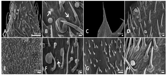 - Mannethody, S.; Purayidathkandy, S. Trichome micromorphology and its systematic significance in Asian Leucas (Lamiaceae). Flora 2018, 242, 70–78. [Google Scholar] [CrossRef]