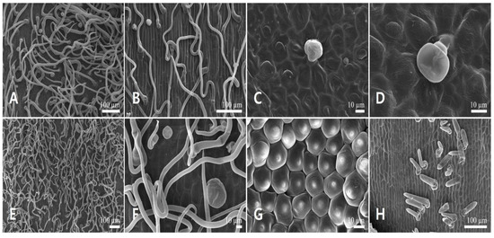 Three shapes of glandular trichomes were identified: capitate stalked, peltate, and scale-like glandular trichomes. Capitate stalked glandular trichomes (C, Figure 2A,B,D–F,H and Figure 3C,D) had one (Figure 3C and Figure 10D), three (Figure 10B), four (Figure 3D), or eight cells (Figure 5D), a 10–20 μm diameter head, and a short stalk cell up to 20 μm in height. Their head surface ornamentation could be smooth. They were distributed on the calyces, except on the adaxial side of the tube, abaxial side of the lip, and the filament in L. japonicus and L. macranthus. However, on the adaxial side of the upper lip, this type of trichome was observed only in L. japonicus (Table 3).