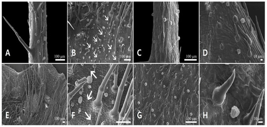 Scanning electron micrographs of the calyx epidermis in Leonurus japonicus. (A,B) Abaxial side of the calyx lobe. (C,D) Adaxial side of the calyx lobe. (E,F) Abaxial side of the calyx tube. (G,H) Adaxial side of the calyx tube. Arrows indicate the stomata.