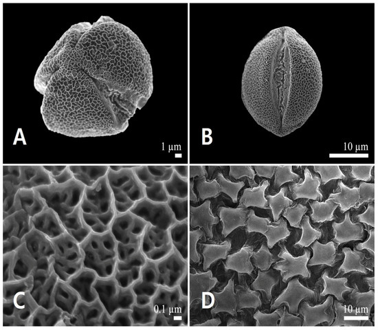 Pollen grains were monads and small-sized (polar axis 23.55 ± 1.31 μm, equatorial axis 20.66 ± 1.22 μm). Polar outlines were almost circular (Figure 9A), spherical to subprolate (P/E = 1.06–1.22). All pollen grains were radially symmetric, isopolar, and tricolpate (Figure 9A,B). The simple colpi were symmetrically distributed. The colpus length was 21.27 ± 1.47 μm. Exine ornamentation was bi-reticulate (Figure 9C). Lumina of the primary reticulum (0.67 ± 0.18 μm) were angular, with diameter more than five times larger than those of rounded secondary ones (0.12 ± 0.02 μm). The primary muri (0.14 ± 0.02 μm) were almost of the same thickness as the secondary muri (0.14 ± 0.04 μm). The number of secondary lumina was 6.35 ± 1.73 per primary lumen (Table 2). The inner side of the anther was smooth; no orbicules were observed (Figure 9D).