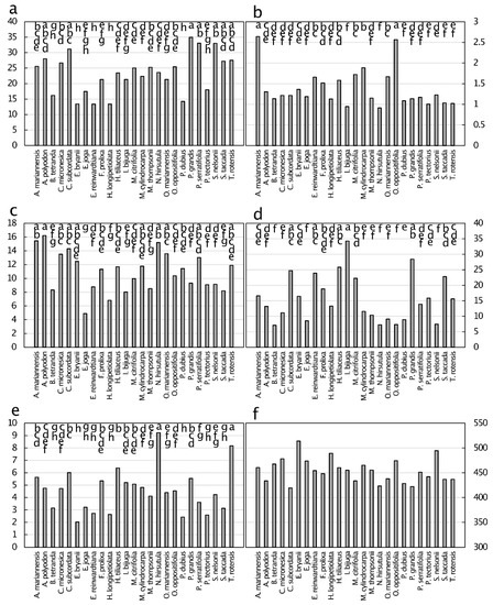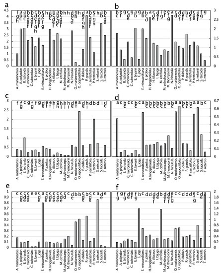 Micronutrient concentration (µg·g−1) of senesced leaf tissue from 25 plant species from Guam’s northern karst forests. (a) Manganese, p < 0.001; (b) iron, p < 0.001; (c) zinc, p < 0.001; (d) boron, p < 0.001; (e) copper, p < 0.001; (f) nickel, p < 0.001. Means separation by the Tukey-Kramer post hoc test. Means with the same letters are not significantly different. n = 6.