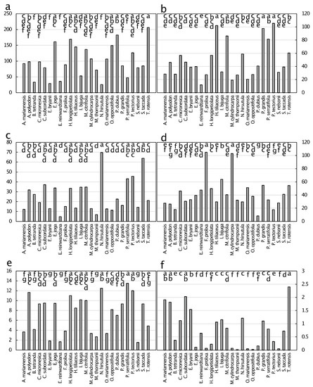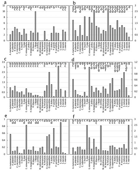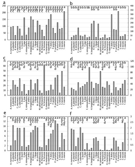 Concentration of metals and metalloids (µg·g−1) of senesced leaf tissue from 25 plant species from Guam’s northern karst forests. (a) Selenium, p < 0.001; (b) lead, p < 0.001; (c) arsenic, p < 0.001; (d) cadmium, p < 0.001; (e) cobalt, p < 0.001; (f) chromium, p < 0.001. Means separation by the Tukey-Kramer post hoc test. Means with the same letters are not significantly different. n = 6.