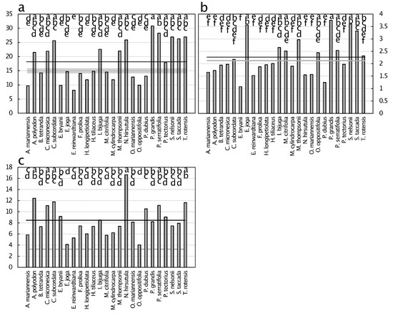 Pairwise quotients of nitrogen, phosphorus, and potassium in green leaf tissue from 25 plant species from Guam’s northern karst forests. (a) nitrogen:phosporus, p < 0.001; (b) nitrogen:potassium, p < 0.001; (c) potassium:phosphorus, p < 0.001. Black horizontal line connecting all bars depicts the overall mean of the Guam data. Gray horizontal line is a demarcation of which nutrient limits plant growth based on global data. Means with the same letters are not significantly different. n = 6.