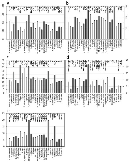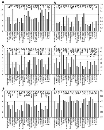 Macronutrient concentration (mg·g−1) of green leaf tissue from 25 plant species from Guam’s northern karst forests. (a) Nitrogen, p < 0.001; (b) phosphorus, p < 0.001 p < 0.001; (c) potassium, p < 0.001; (d) calcium, p < 0.001; (e) magnesium, p < 0.001; (f) Carbon, p = 0.643. Means separation by the Tukey-Kramer post hoc test. Means with the same letters are not significantly different. n = 6.