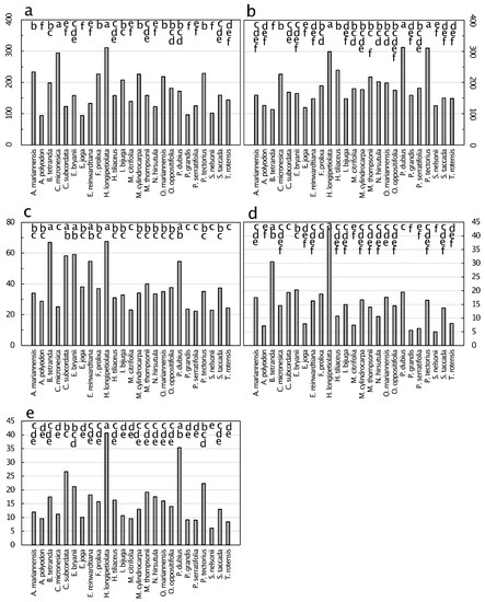 Green leaf tissue traits from 25 plant species from Guam’s northern karst forests. (a) Lignin, mg·g−1, p < 0.001; (b) cellulose, mg·g−1, p < 0.001; (c) carbon:nitrogen, mg·g−1, p < 0.001; (d) lignin:nitrogen, mg·g−1, p < 0.001; (e) cellulose:nitrogen, mg·g−1, p < 0.001. Means separation by Tukey-Kramer post hoc test denoted by horizontal bars at top of each panel. Means with the same letters are not significantly different. n = 6.