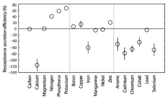 Nutrient remobilization or accumulation during leaf aging and senescence was determined for each of the 18 elements by the formula ((green-senesced)/green) × 100. When this calculation is positive, the metric is defined as “resorption efficiency” for non-structural elements that are mobilized and returned to the stem tissue during leaf senescence [15,16]. When the calculation is negative, the metric defines the relative accumulation which occurs for individual elements from the age of full leaf expansion until leaf senescence. This metric has been called “null resorption” [33]; here, I introduce use of the term “accretion efficiency” for this metric. A statistical test of the differences among the species was difficult due to the heterogeneous variances and different direction of resorption versus accretion. Therefore, the data are presented as means ± standard error.