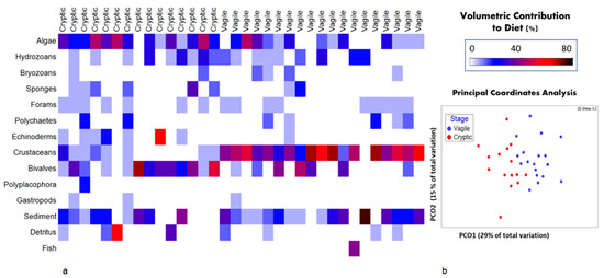 (a) Distribution of standardized volumetric contribution to diet (%) of 15 items for two juvenile ontogenetic phases of Lithodes santolla. (b) Ordination pattern of samples by principal coordinate analysis (PCA) on a resemblance matrix. An individual without stomach content was excluded from the analysis.