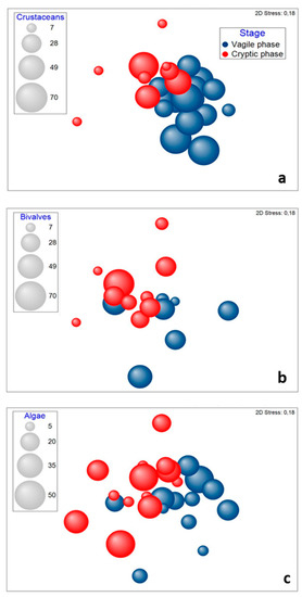 Stomach content: To compare crab diets in both stages, a PERMANOVA was performed on the matrix of volumetric contribution per item for each juvenile crab. Additionally, a similarity percentage analysis (SIMPER) was conducted to determine which prey species made the greatest contribution to dissimilarities in the diet between ontogenetic stages. Similarities among individuals were visualized by a principal coordinate analysis (PCO) using the Bray–Curtis similarity matrix [43]. All analyses were performed in PRIMER v7 [44].