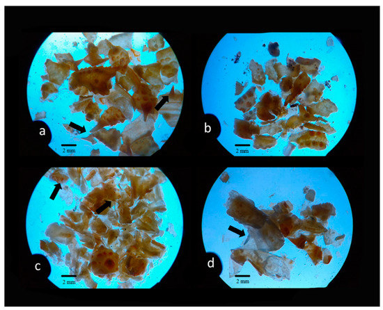 Examples of stomach contents showing a high volume of crustacean items, especially king crabs exoskeleton debris. Size of individuals (a) 88 mm CL, (b) 51mm CL, (c) 67 mm CL, (d) 63 mm CL. Arrows show the spines, characteristic of Lithodes santolla.