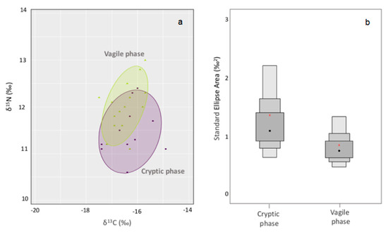 Isotopic niche areas of vagile and cryptic southern king crab juveniles sampled in Aguila bay. (a) Bivariate plot of δ13C and δ15N values showing standard ellipse area corrected for small sample size (SEAc). (b) Boxplots of model-estimated bivariate standard ellipse area (SEAb) for cryptic and vagile phase. Dark, medium and light gray boxes are respectively the 50%, 75% and 95% confidence intervals of the probability density function distributions of the model’s solutions, and black dots are the modes of these distributions. Red dots are the SEAc values associated with each group.