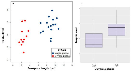 The average trophic position estimated for cryptic phase individuals was 2.52 ± 0.17, while for the vagile phase it was 2.73 ± 0.14, which is consistent with significant differences observed in the trophic position of the juvenile phases (permutation test, Pperm = 0.021, permutation = 4820) (Figure 5).