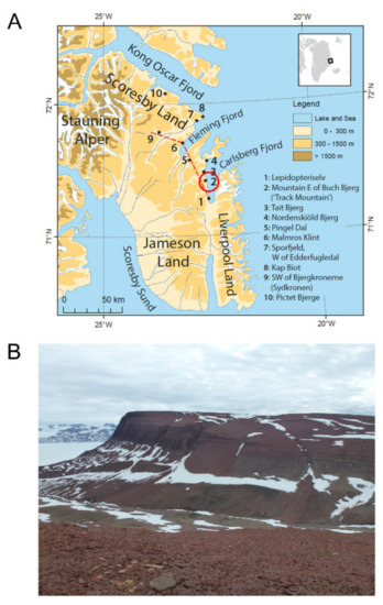 Topographic map of Jameson Land, central East Greenland. (A) Topographic map of Jameson Land. The Macknight Bjerg site of the Malmros Klint Formation is marked by the red circle and number 2. Modified from [25]. (B) Photograph of the outcrops in Buch Bjerg “Track-site”.